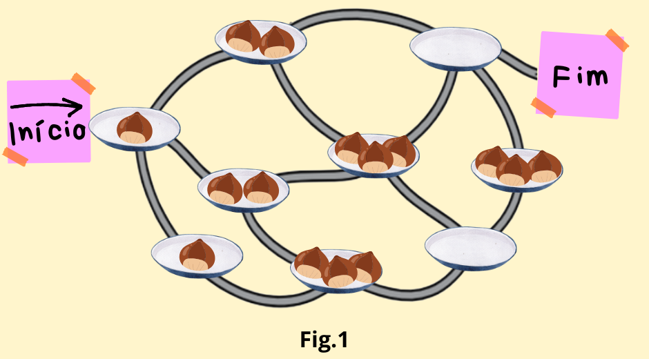 Sobre a mesa da sala, o Adolfo construiu um engenhoso sistema de caminhos com cordas e pratos, tendo colocado castanhas em alguns deles. Lançou então um desafio ao seu sobrinho: deverá escolher um percurso desde o ponto 'Início' até ao 'Fim'. A sua missão é colher o maior número possível de castanhas ao longo do caminho, mas com duas condições: não poderá passar duas vezes pelo mesmo caminho; e ao passar por um prato vazio, deverá obrigatoriamente depositar uma das castanhas que já colheu.