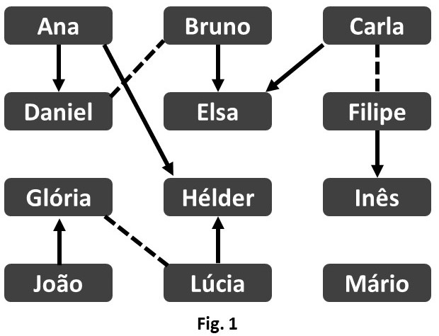 O Adolfo foi convidado para gerir os resultados de um torneio de xadrez dinamizado pela associação a que pertence. Os jogadores defrontam-se entre si num único jogo. Na Fig.1 cada seta é desenhada do vencedor para o derrotado (ex: Bruno venceu a Elsa) e a linha a tracejado representa um empate (ex: o Bruno empatou com o Daniel). São atribuídos três pontos à vitória e um ponto ao empate. No final do torneio, vence o jogador que obtiver o maior número de pontos. Haverá um prémio "muito especial" para o jogador que conseguir vencer todos os seus jogos.